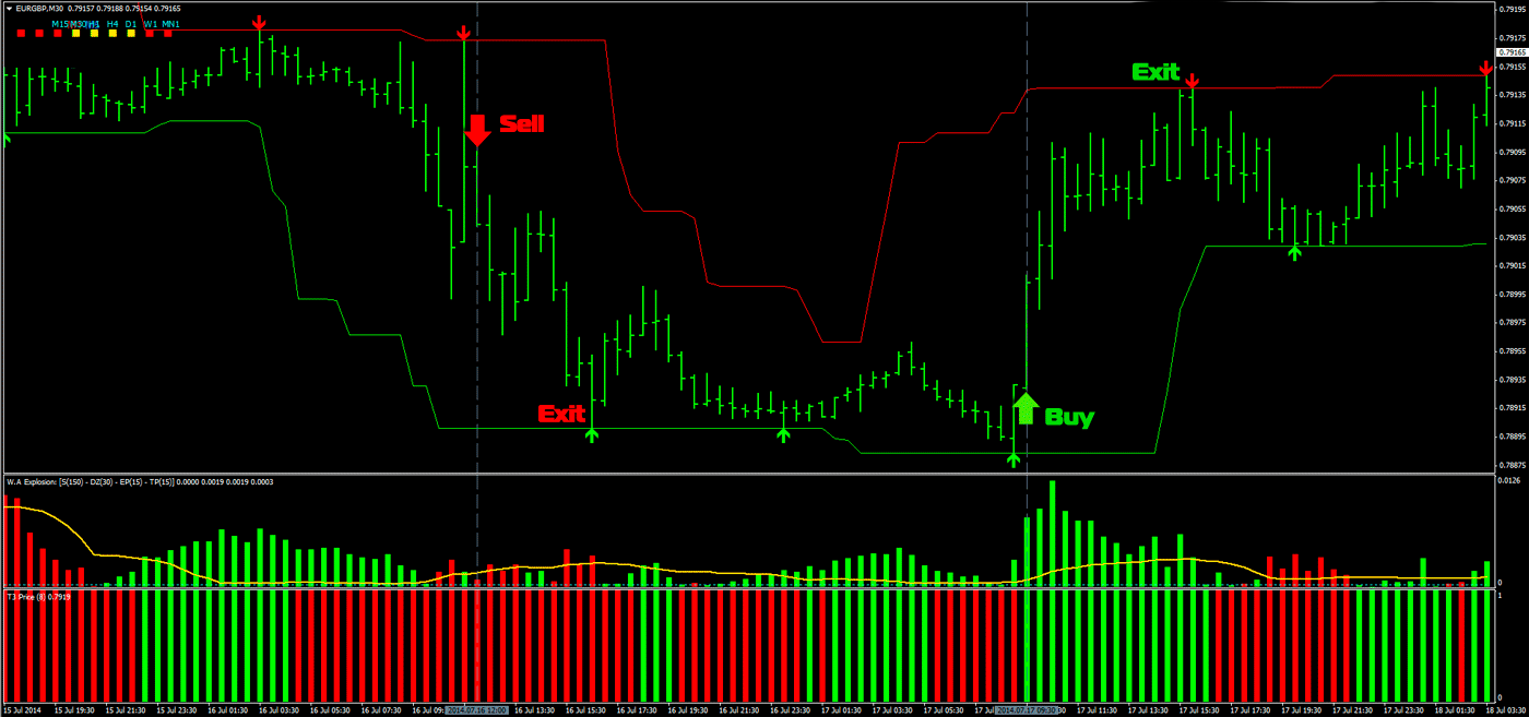 当出现绿色箭头或WAExplosion/T3 2ColorHisto任一指标转绿时平仓。